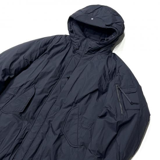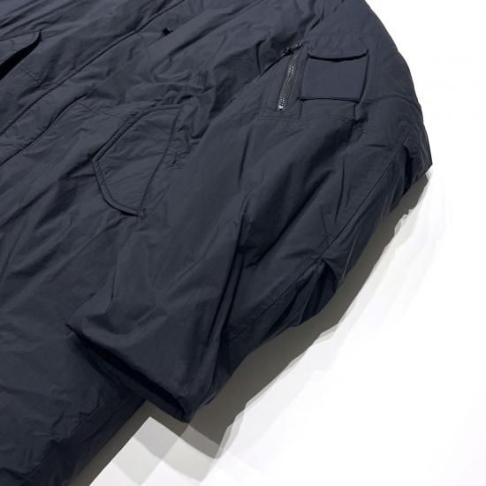 ミリタリーのフィールドコートを思わせる、膝上丈のフードコートです。 2枚袖ラグランのパターン、脇下のマチ、肘部分のタックにより、快適な動きをサポート。脇下、肘内側の中綿を抜き、脇下にはファスナーのベンチレーションを配置し着心地の良さを実現。フードのツバ部分は、ドットボタンで出し戻しできる仕様。顔周りを防風するフェイスガード付き。大容量の内ポケットや、服を脱いた際に2wayで背負える(両肩掛け、斜め掛け)ディテールを採用。裾口のスピンドルは、シルエット調節だけでなくウィンドストッパーとしても機能。