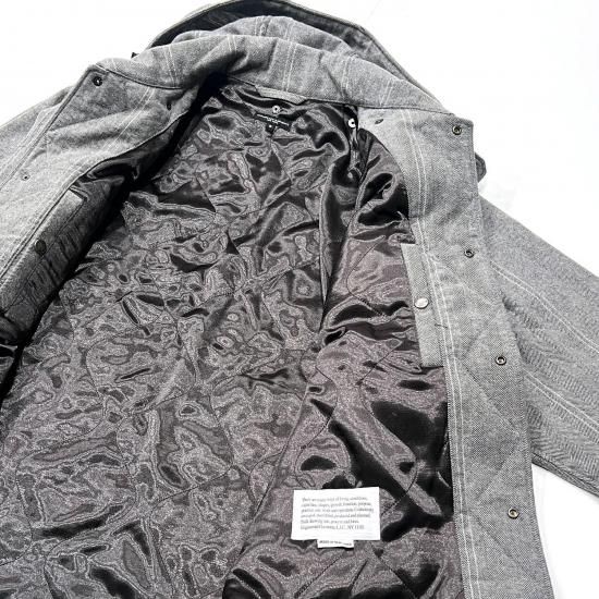 スポーティーでシンプルなウィンドブレーカーをベースに、EGらしい凝ったディーテールが魅力のアウターです。スナップボタンの付いた取り外せるフード、襟にはチンストラップを備えおります。前立てスナップボタン部分はダイヤ型のステッチワークが施され、腰にはゲームポケットを配置しております。シックなカラーリングのウールストライプのヘリンボーン素材を使用。