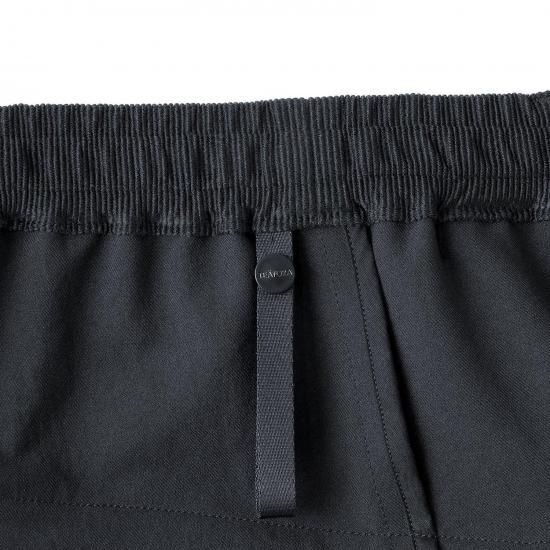 凹凸感を抑え、しなやかでソフトな肌触り。毛足は短め。うっすらと感じる光沢感。程良い厚みの暖かな素材感。カジュアルでありながらも綺麗な雰囲気も併せ持つ。日常からビジネスのシーンまで対応するテキスタイル。洗濯可能、型崩れにも強い。ウエストはゴムとスピンドルによるイージーパンツ仕様で幅広いサイズに対応。ヒップや股上にゆとりを持たせた太めのシルエット。テーパードを強調する事で太さはあるものの上品なボリューム感。1タックデザイン。様々なシリーズのトップスとの着用が可能。