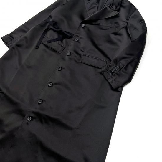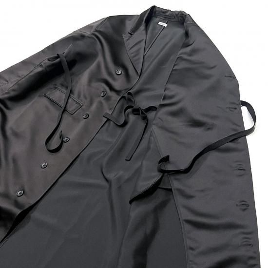 ピークドラペルが特徴的なタキシードをモチーフにデザインしたTux Dress。胸ポケット、左右にフラップ付きのポケット、左右のサイドラインにハンドウォーマーポケットを配置。外側と内側にドローストリングスを備えシルエット調整可能です。素材には美しい光沢感と適度な張りがあるサテン素材を使用。